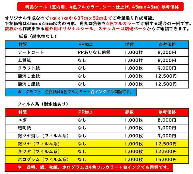 商品シール(室内用、4色フルカラー, シート仕上げ, 45㎜x45㎜) 参考価格